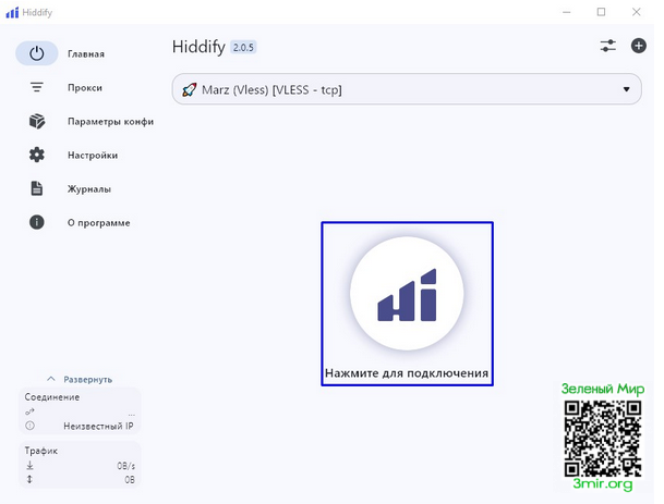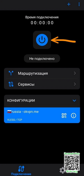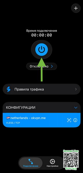 4) Нажимаете на синюю кнопку в центре, чтобы включить VPN. После подключения кнопка станет зеленой. Чтобы отключить VPN — нажимаете на зелёную кнопку