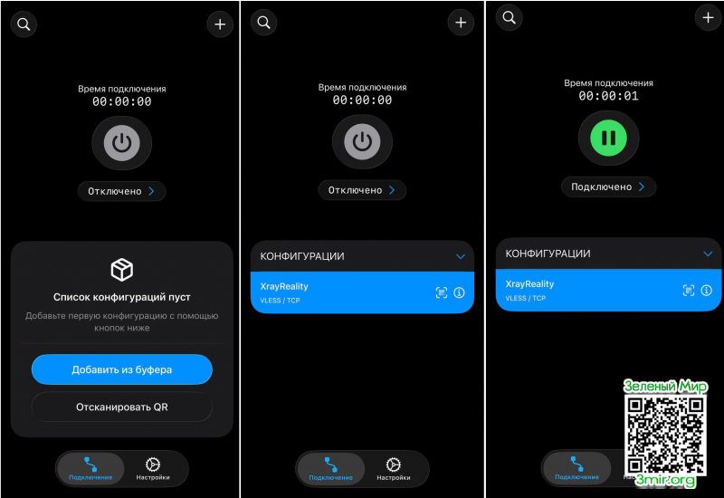 3) Заходите в приложение v2RayTun и нажимаете на кнопку "Добавить из буфера" или сканируете qr код из поста выше.