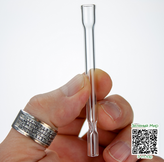 Следующий стеклянный чилим полная противоположность предыдущему экземпляру. Он миниатюрен и изящен, его длина составляет всего лишь 8 см. Соответственно, стаффа поместится буквально на одну затяжку. Это именно тот случай, когда чиллум позиционируется как трубка одного напаса.